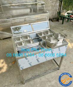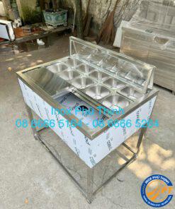 Bố trí 10 khay 1/6 (1.5l) trên bề mặt thao tác có nắp kính gập có thể nhìn thấy các loại thạch topping bên trong khay