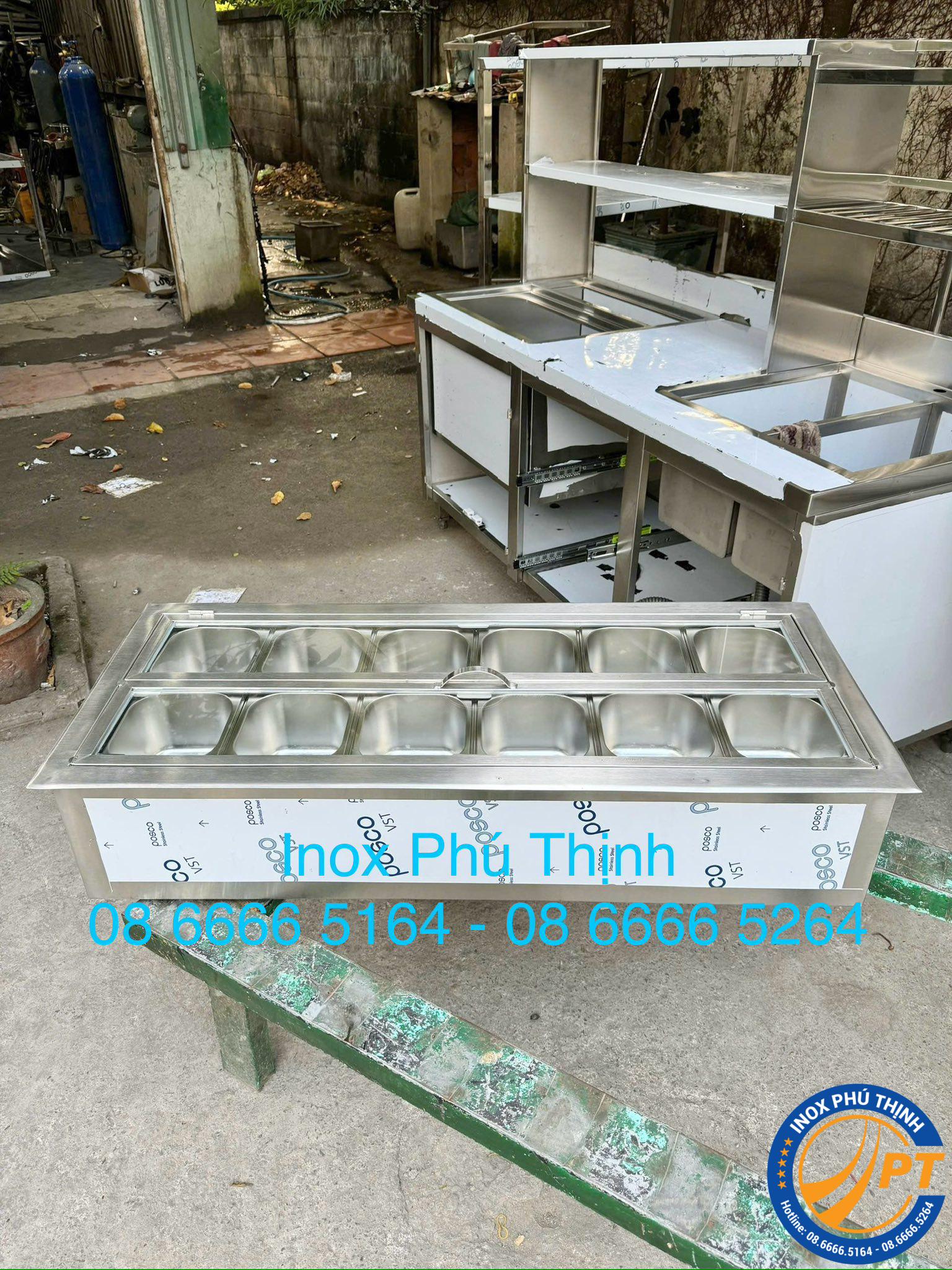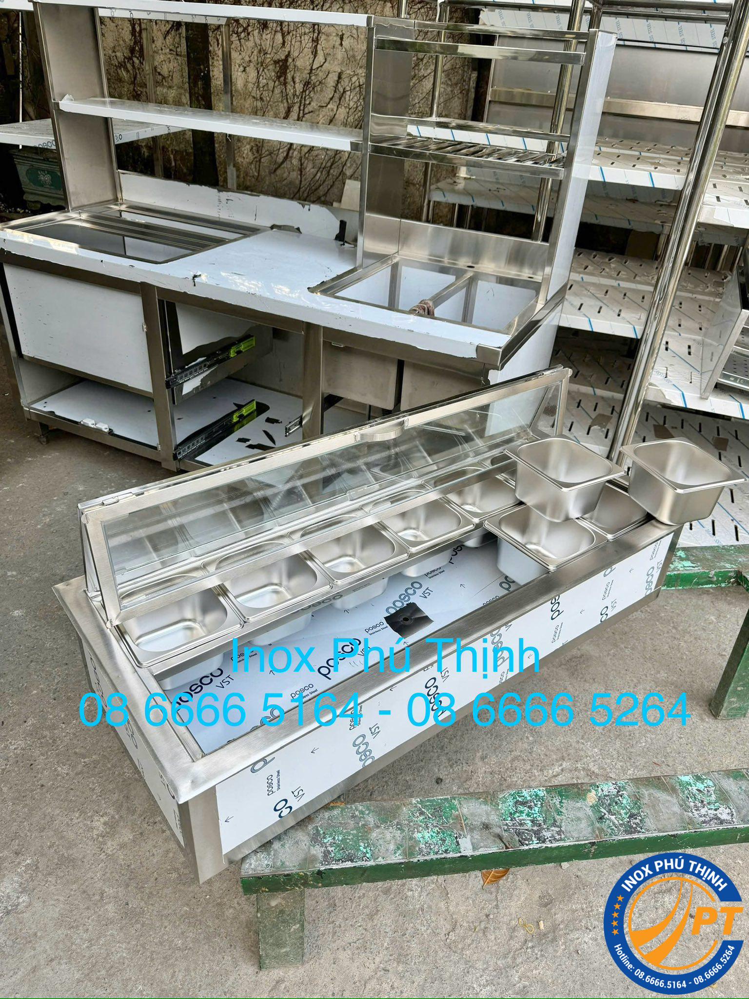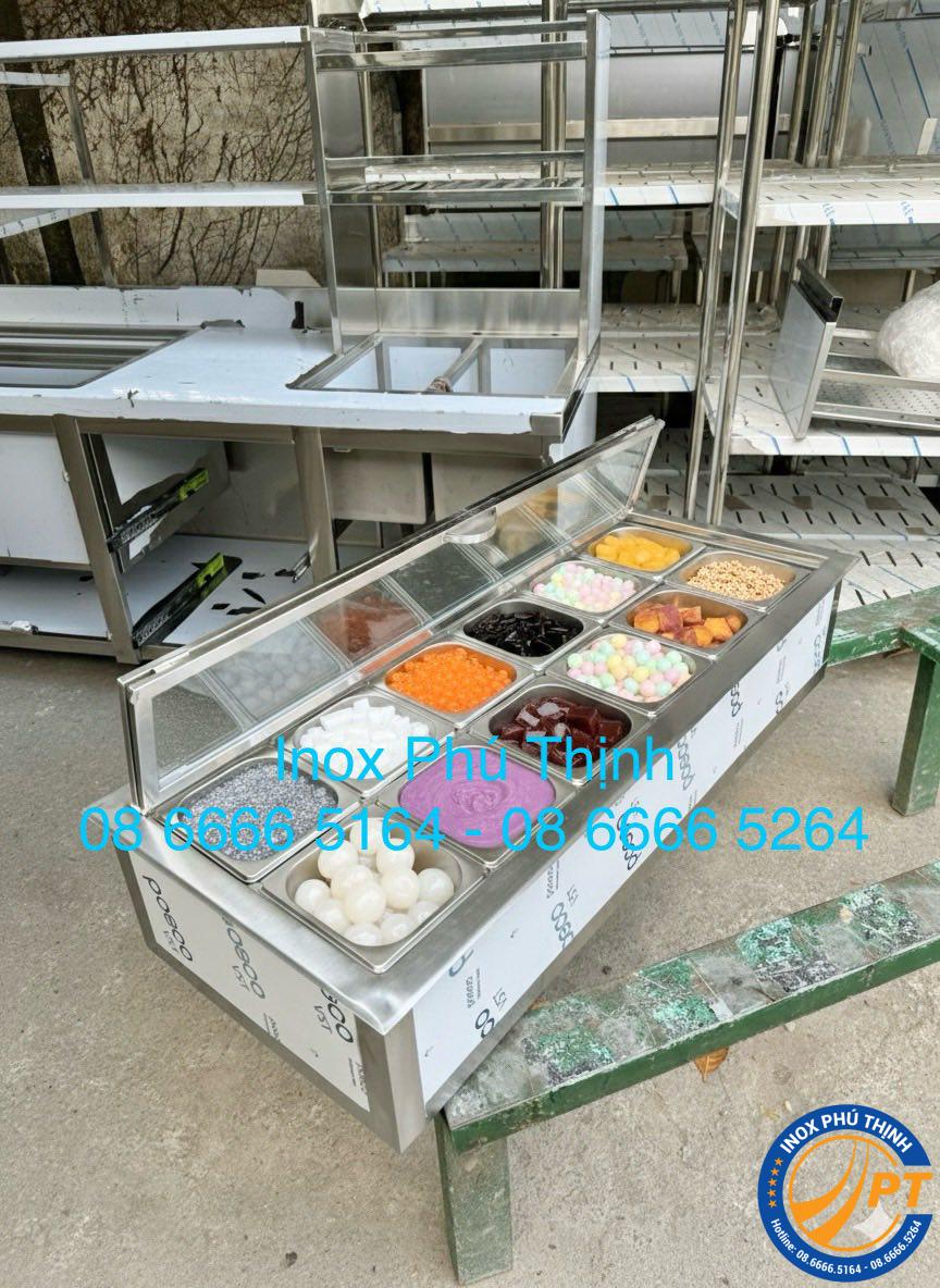 Bố trí 12 khay 1/6 (1.5l) trên bề mặt thao tác có nắp kính gập có thể nhìn thấy các loại thạch topping bên trong khay
