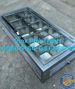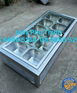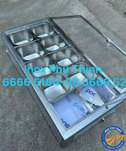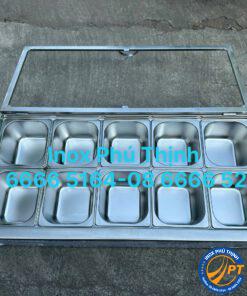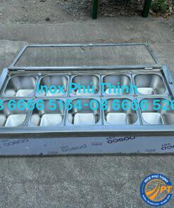 Bố trí 10 khay 1/6 (1.5l) trên bề mặt thao tác có nắp kính gập có thể nhìn thấy các loại thạch topping bên trong khay
